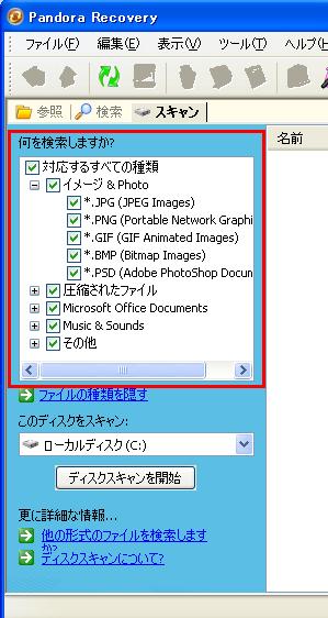 5.ファイルの復元 まずは、Pandora Recoveryを起動してください。 3種類の検出方法があります。 参照⇒検索⇒スキャンの順に試してください。 5−1.参照 検出するドライブをクリック すぐに、結果が表示されます。 ここで見つかったら軽症です。高い確率で復元できます。 ここでみつかったら復元へ 5−2.検索 検索をクリック ドライブを選んで検索をクリック 結果が表示されます。 ここでみつかったら復元へ 5−3.スキャン スキャンをクリック スキャンの画面が開きました。 まずは、復元するファイルの種類を選択します。 このように復元するファイルの種類を細かく指定できます。 但し、種類を指定してもスキャンにかかる時間はあまりかわりません。 スキャン後、復元させるファイルを探すのが楽になるだけです。 ですから全部チェックした状態のままでも、かまいません。 復元させるファイルが入っているドライブを指定します。 ディスクスキャンを開始をクリック スキャン中。かなり時間がかかります。 この例では1時間以上かかりました。(2GのUSBメモリです) 完了しました。 5−4.復元 復元させたいファイルを探してください。 このリストに無かったら復元はできません。 別のソフトを試してください。 @ 復元したいファイルを選択 複数有る場合は、Ctrlキーを押しながらクリックすると追加選択できます。 Shiftキーを押しながらクリックすると間のファイルが全て選択されます。 A 復元ボタンをクリック 復元したファイルを入れる場所を指定します。 参照ボタンをクリック 場所を選択してOKをクリック 復元開始をクリック 復元完了 エクスプローラを使って復元したファイルを確認しましょう。 エクスプローラの使い方がわからなければこちら 復元できました。 うまく行かなかったら質問その他を 掲示板へ書き込んでください。 このページの先頭へ ファイルやデータの復元へ戻る |