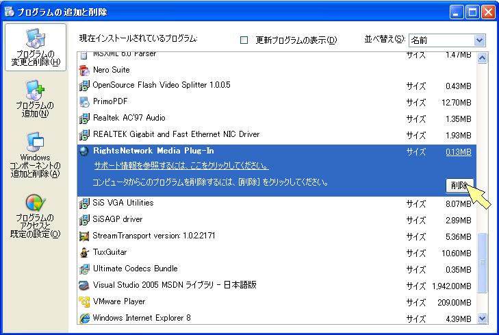 1.駆除方法 1)コントロールパネルを開く。 スタートメニューの右の方のコントロールパネルをクリック 2)プログラムの追加と削除 プログラムの追加と削除をクリックします。 3)RightsNetwork Media Plug-In RightsNetwork Media Plug-Inを探す 見つかったらクリック。 (見つかったということはこのソフトがインストールされていたということです。) 削除をクリック 別にブラウザ(IEなど)を終了させなくてもできるようですが一応終了させてください。 4)アンインストール 次へ アンインストール 完了 このページの先頭へ |